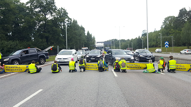 Tolv aktivister från gruppen Återställ våtmarker döms för sabotage och ohörsamhet mot ordningsmakten till villkorlig dom och skyddstillsyn. Gruppen blockerade E4 utanför Solna den 29 augusti i år, vilket stoppade rusningstrafiken samt en ambulans.