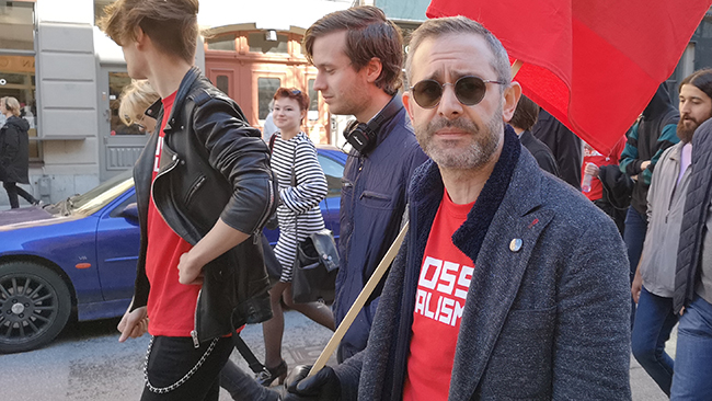 Aron Flam demonstrerar mot SVT på första maj: ”Tränger ut fri media”