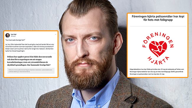 Högerdebattören Ivar Arpi anmäls för hets mot folkgrupp efter ett inlägg på Twitter. Bakom anmälan står vänsterföreningen Hjärta, som tidigare var knuten till S, och dess styrelsemedlem Mattias Irving. ”Om jag hade varit en lika stor tönt hade jag anmält dem för förtal”, skriver Arpi om anmälan.