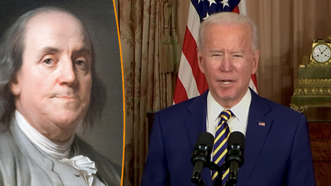 Talet igenom hänvisade Biden till USA:s författningsfader Benjamin Franklin, USA:s störste diplomat som på egen hand förhandlade fram Frankrikes avgörande stöd för den amerikanska revolutionen 1776. Men Biden försökte även använda Franklin för att legitimera sina egna idéer: