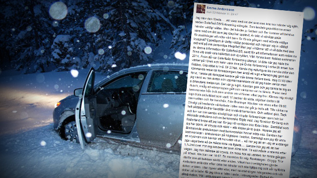 SOLLEFTEÅ ”Utan byxor eller skor, med navelsträngen hängandes och vår dotter på bröstet får jag kliva ur bilen i snön, i minusgrader. Blottad för allmänheten.” Så beskriver mamman Emma Andersson hur det var att föda i bilen för att politikerna lagt ner hennes BB i Sollefteå. ”Fan ta er politiker”, avslutar hon ett inlägg på Facebook.