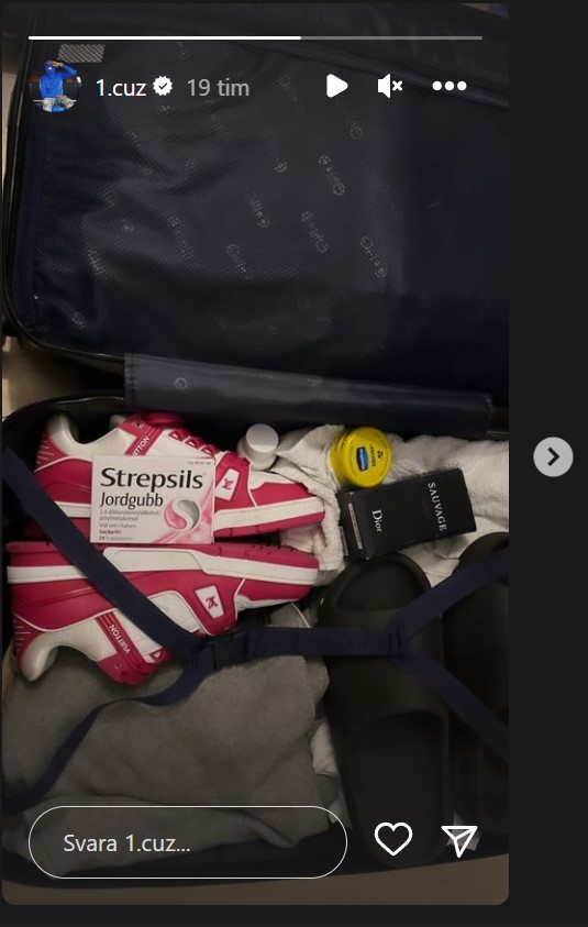 I natt lade 1.Cuz upp en Story på Instagram som visar en packad resväska.