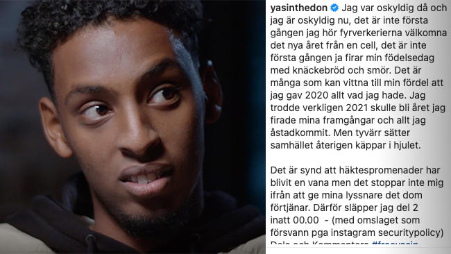 SVERIGE Rapparen Yasin sitter häktad misstänkt för stämpling till människorov, men hävdar sin oskuld i ett inlägg på Instagram. Där klagar han också på att ”samhället” sätter käppar i hjulet för honom.
