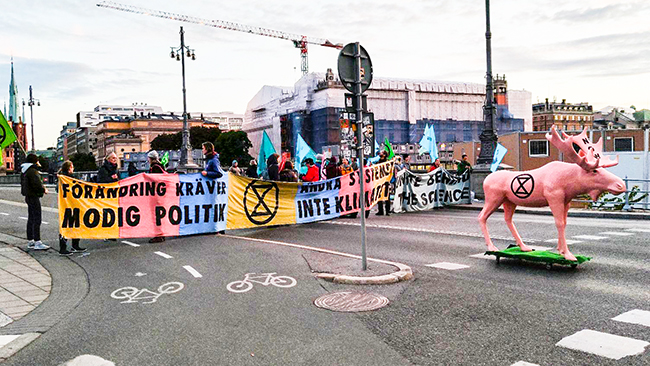 Vasabron och Norrbro i centrala Stockholm blockerades på fredagsmorgonen av ett enligt Aftonbladet 80-tal medlemmar i Extinction Rebellion utrustade med banderoller. Varken bussar eller bilar släpptes fram och lokaltrafiken fick lägga om sin rutt.