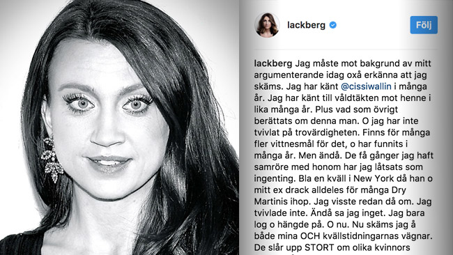 ”Ändå sa jag inget. Jag bara log o hängde på. O nu. Nu skäms jag å både mina OCH kvällstidningarnas vägnar. De slår upp STORT om olika kvinnors vittnesmål men skriver INGET om att svenska modighetslavinen startade med Cissi angående en medarbetare på @aftonbladet . De har ju vetat. Vi i ”svängen” har ju vetat. I många år. O vi bör skämmas nu för vår tystnad”, skriver Läckberg.