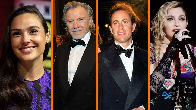 Gal Gadot, Harvey Keitel, Jerry Seinfeld och Madonna. Bild: Gage Skidmore/CC BY-SA 2.0/Public Domain/Alan Light/CC BY 2.0/chrisweger/CC BY-SA 2.0