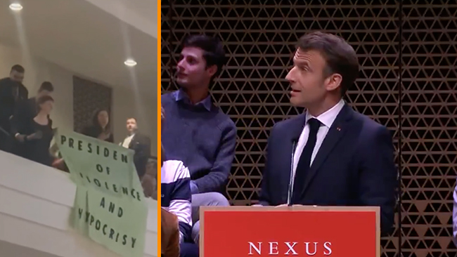 På tisdagen höll Frankrikes president Emmanuel Macron ett tal i den nederländska staden Haag, vilket var starten på ett två dagar långt statsbesök i landet. Då avbröts han av en grupp häcklare i publiken.