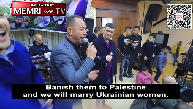 En bröllopssångare på ett palestinskt bröllop uppmanar Rysslands president Vladimir Putin att ”öka sina attacker” och fördriva ukrainare till Palestina, så att palestinska män ska kunna gifta sig men ukrainska kvinnor.