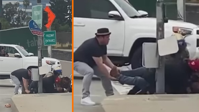 En vägpolis i Santa Ana, Kalifornien räddades av förbipasserande som ingrep när polismannen blev misshandlad av en misstänkt. Hela förloppet fångades på film som spridits på sociala medier.
