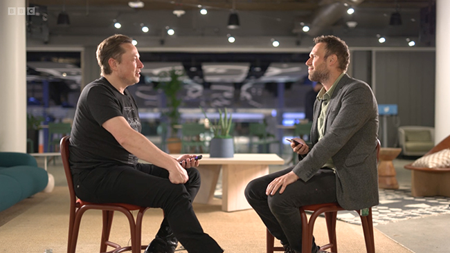Den nära timmeslånga intervjun med Elon Musk finns i sin helhet på BBC:s hemsida.