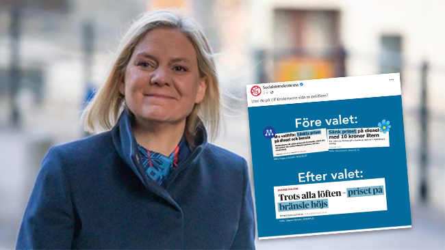I ett inlägg som Socialdemokraterna publicerade på Facebook på fredagen har partiet klippt ut rubriker från valrörelsen, där M och SD lovar sänkta priser på diesel och bensin. Detta kontrasteras med en rubrik från Dagens Nyheter som lyder ”Trots alla löften – priset på bränsle höjs”.