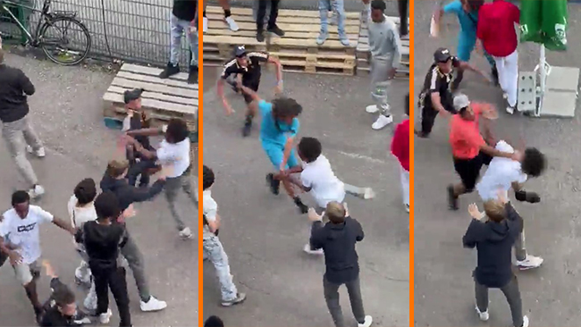 På videon kan man se en stor grupp ungdomar knuffas, slåss och sparkas. En del faller till marken och utsätts för misshandel.
