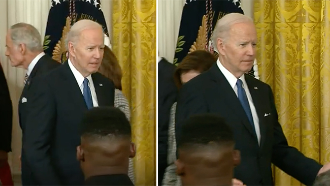 Efter att både Biden och Obama hållit sina tal och Biden skrivit under ordern ses presidenten en kort stund planlöst ströva omkring i minglet, ensam och till synes förvirrad.