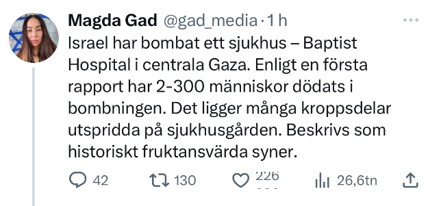 Kritiken mot oppositionsledaren Magdalena Andersson är hård efter att hon anklagat Israel för att ha bombat ett sjukhus. Senare uppgifter pekar på att det kan ha varit en raket avfyrad från Gaza som träffade sjukhuset. Även Expressens krigskorrespondent Magda Gad, Aftonbladet, BBC, Reuters och The New York Times sågas för att ha spridit Hamas narrativ om sjukhusbombningen.