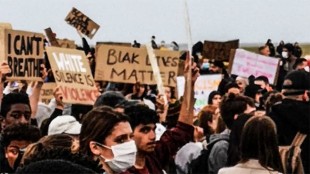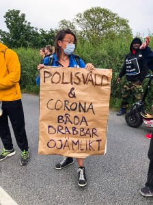 MALMÖ Under torsdagskvällen samlades tusentals personer på Ribersborg utanför Malmö för att demonstrera trots förbudet mot samling över 50 personer. När polisen avblåste demonstrationen gick folkmassan in mot centrum. Demonstranterna höll i skyltar med polisfientliga budskap och samma budskap som den kvinnliga knäböjande polisen höll upp på en skylt i Stockholm – ”White silence is violence”.