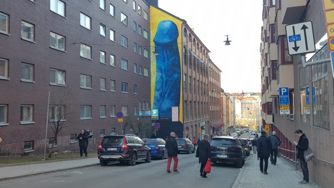 Sedan onsdagen finns konstverket på en laglig gatukonstvägg på Kronobergsgatan. Konstnären Carolina Falkholt har tidigare gjort ett liknande konstverk i New York, men då var penisen röd och rosa.