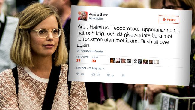 En kontroversiell tweet från Aftonbladets ledarskribent Jonna Sima möter kraftig kritik från flera debattörer. ”Arpi, Hakelius, Teodorescu.. uppmanar nu till hat och krig, och då givetvis inte bara mot terrorismen utan mot islam. Bush all over again”, skriver hon på Twitter.