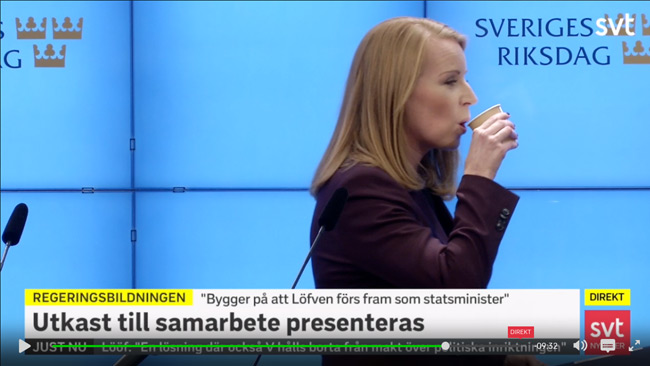 Istället tar Lööf upp en pappmugg, tar några klunkar, samtidigt som hon skyndsamt lämnar presskonferensen bakom sig. Allt sker mitt framför kamerorna och dokumenterades bland annat i en livesändning i SVT Play.