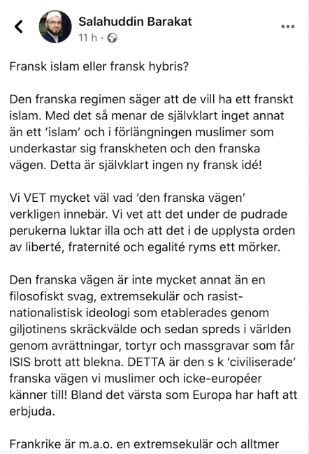 I sitt nya Facebookinlägg skriver den kände imamen och lokale Malmöprofilen Salahuddin Barakat att hans numera raderade inlägg från 7 oktober (nio dagar innan halshuggningen av läraren Samuel Paty) kom ”olägligt”.