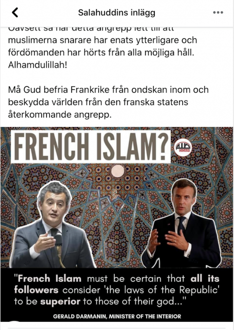 Sitt numera raderade inlägg skrev han efter ett tal den 2 oktober av Emmanuel Macron där denne lanserade en rad åtgärder för att slå mot islamistisk separatism och bejaka fransk islam.