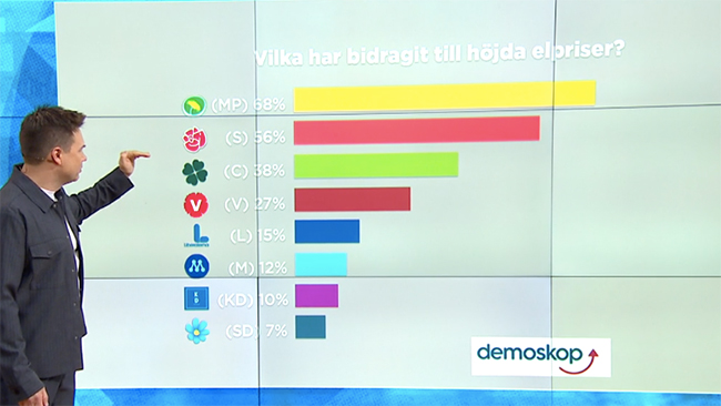 Demoskop har frågat folk vilket parti man uppfattar har bidragit mest till de höjda elpriserna. 68 procent svarar Miljöpartiet som därmed hamnar i topp, följt av Socialdemokraterna på 56 procent. De svarande har kunnat ange flera partier.
