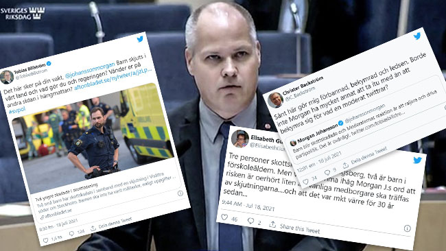 Efter helgens skottdrama i Flemingsberg där två små barn skottskadades är kritiken mot justitieminister Morgan Johansson (S) hård på sociala medier. Men när Tobias Billström (M) frågar Johansson om han tänker göra något åt skjutvåldet eller vända sig ”på andra sidan i hängmattan” går Johansson till motattack och anklagar Billström för att utnyttja händelsen till att ”raljera och driva partipolitik”.