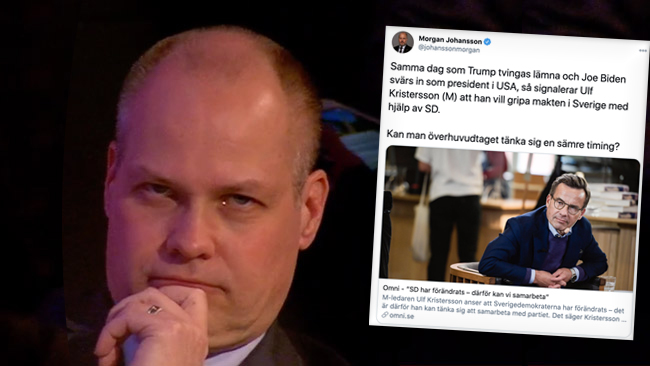 SVERIGE Ulf Kristersson kan tänka sig att samarbeta med SD för att kunna bilda regering meddelade han i SVT:s nya program 30 minuter på onsdagen. Det upprör justitieminister Morgan Johansson (S) som kopplar det till att Joe Biden samma dag svors in som president i USA. ”Kan man överhuvudtaget tänka sig en sämre timing”, undrar Johansson i en tweet – nu har justitieministern hamnat i blåsväder.