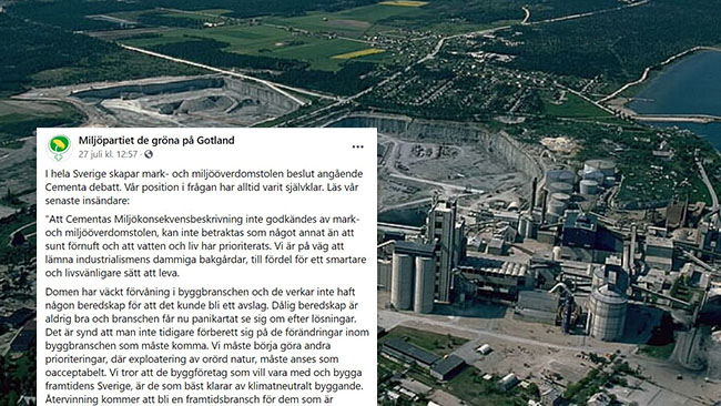 Nu kommenterar Miljöpartiet på Gotland domen och den följande cementkrisen. I en insändare publicerad i tidningen Hela Gotland, som MP på Gotland även publicerat på Facebook, skriver Katarina Krusell från regionstyrelsen och Ola Matthing, som är gruppledare, bland annat att ”Vi är säkra på att människan kan utveckla ett sätt att bygga utan cement”.