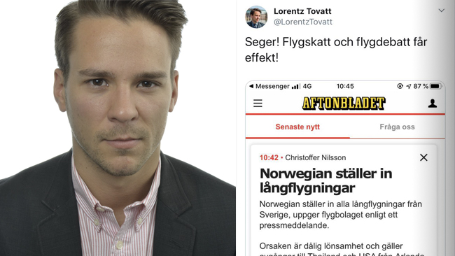 STOCKHOLM På onsdagen meddelade lågprisbolaget Norwegian att man lägger ner alla långdistanslinjer till Thailand och USA, något som Expressen rapporterat. Det firas av Miljöpartiets klimatpolitiske talesperson Lorentz Tovatt. ”Seger! Flygskatt och flygdebatt får effekt!”, skriver han på Twitter.
