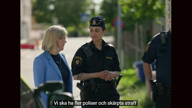 I socialdemokraternas valfilm, som fokuserar på statsminister Magdalena Andersson, inleder Andersson med att lova ”fler poliser och skärpta straff”.