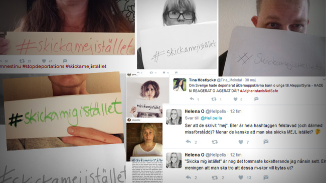 TWITTER ”Skicka mig istället”, så vädjar svenska twitteranvändare om att få bli utvisade så att någon av de asylsökande kan ta deras plats i Sverige. Kampanjen i sociala medier kommer i spåren av att det skett nya terrordåd i det krigshärjade Afghanistan dit Sverige utvisar afghaner som fått avslag på sina asylansökningar.