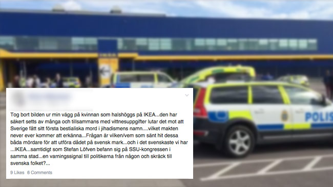 En äldre kvinna skriver en status på Facebook om otäcka bilder hon sett i samband med knivdådet på Ikea. Enligt kvinnan visar de otäcka bilderna hur ett huvud avskiljts från kroppen, något hon skriver om i en status. Bilden ska vara tagen i samband med knivdådet på Ikea där två personer mist livet. Uppgiften får stor spridning och återges i bloggar och på den mindre seriösa sajten ”Exponerat”.