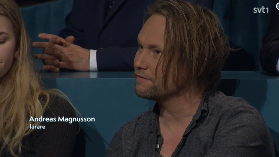 Under programmet så deltar bland annat Liberalernas partiledare Jan Björklund i en debatt om skolan och om den blivit för svår. Från läktaren hörs läraren och vänsterdebattören Andreas Magnusson först konstatera att man ibland ska vara mer flummig i skolan för att sedan håna Björklund.