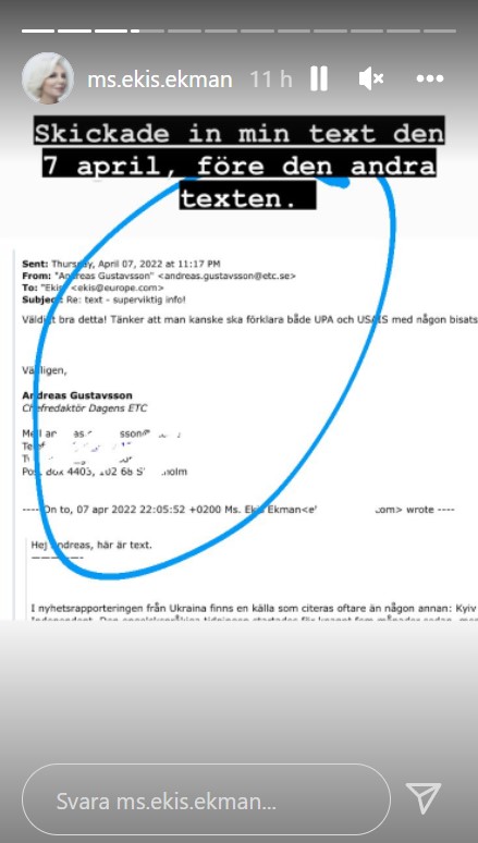 Att Gustavsson berömde Ekmans text bekräftas av en skärmdump på Gustavssons svarsmejl till henne som Ekman publicerat på Instagram stories. Instagram stories-publiceringar är tillfälliga, nedan följer en skärmdump som Nyheter Idag tagit av Ekmans inlägg.