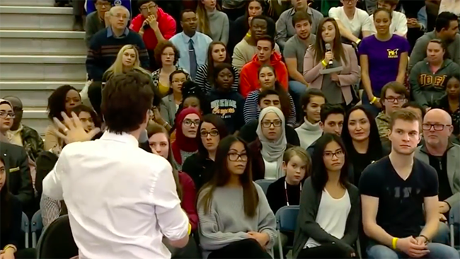 Under utfrågningen ställde sig en kvinna upp och inledde sin fråga med budskapet att moderskärlek är den kärlek som kommer att förändra framtiden för mänskligheten, ”mankind”. Trudeau, en stolt feminist enligt sin talesperson, viftade då med händerna, avbröt kvinnan och sade: ”Vi föredrar att säga ’peoplekind’, inte nödvändigtvis ’mankind’. Det är mer inkluderande.”