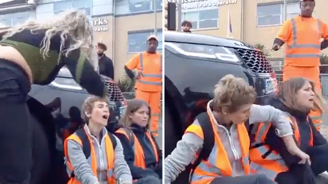 STORBRITANNIEN I England har det blivit en ny trend för klimataktivister att blockera vägen för bilister i klimatprotest. Nu har en ny video spridit sig där en rasande mamma försöker flytta på dem eftersom hon ska köra sin 11-årige son till skolan. Aktivisterna vägrar dock att röra på sig varpå mamman sätter sig i bilen och kör in i dem.