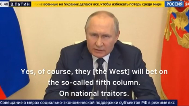 – Väst kommer naturligtvis satsa på den så kallade femte kolonnen. Våra nationella förrädare. På de av oss som tjänar pengar här, hos oss, men bor där. Och de lever inte bara i ordets geografiska mening, utan enligt sina tankar, enligt sitt slaviska medvetande, säger Putin och fortsätter: