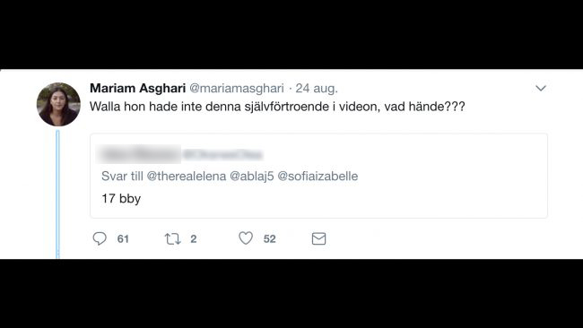 En Twitteranvändare hånar tjejen i filmen och skriver ”Hahahaha vad är hon ens? 12?”. Tjejen som syns i filmen, och som på Twitter uppger att hon är sverigedemokrat, svarar själv att hon är 17 år. Då ansluter den socialdemokratiska riksdagskandidaten Mariam Asghari i näthatandet. Hon har synpunkter på tonårstjejens uppträdande i filmen.
