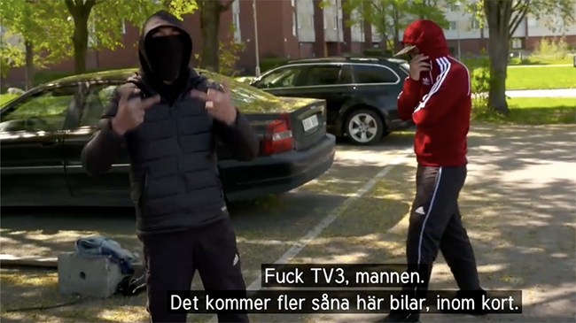 – Fuck TV3, mannen. Det ska komma mer sådana här bilar inom kort, säger en av dem och pekar finger mot kameran för att sedan gå vidare.