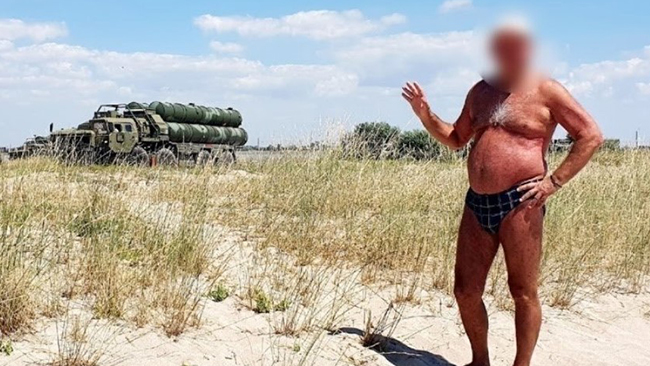 Ukrainas försvarsmakt tackar en rysk turist för att han avslöjat positionen på ryskt luftvärn på den ockuperade Krim-halvön när han poserade med badbyxor på ett foto.