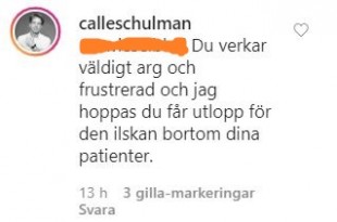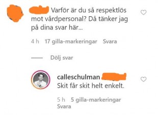 Schulmans kommentar får hård kritik. ”Fult skrivet av dig. Skäms” skriver en användare, ”Rutten människa som skriver så till någon som jobbar i vården” skriver en annan. ”Någon som jobbar i vården. Hahah” svarar Schulman.