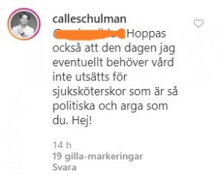 ”Är på väg till sjukhuset för att arbeta , det känns som ett hån när jag ser er” skriver en användare, vilket Calle Schulman besvarar med ”Bäst du avföljer. Eller byter jobb”.