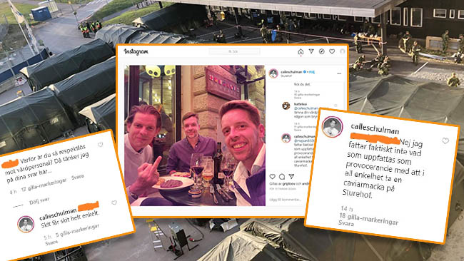 STOCKHOLM ”Bäst du avföljer. Eller byter jobb” skrev Stureplansprofilen Calle Schulman till en vårdarbetare som blev provocerad av en bild han lagt upp på Instragram på sig och sina bröder på restaurangen Sturehof. När Schulman kritiserades för sin ton mot vårdpersonal svarade han att ”skit får skit helt enkelt”, och argumenterade för att ”smittan SKA spridas i en lagom takt.