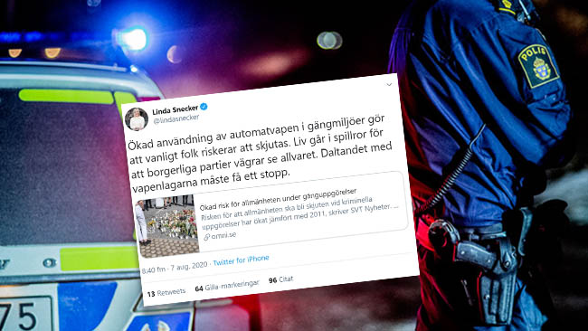 Snecker skriver även att ”daltandet med vapenlagarna måste få ett stopp” i inlägget, där hon också delar en artikel från Omni som handlar om att risken för att oskyldiga skjuts vid kriminella uppgörelser har ökat sedan 2011, samtidigt som användningen av automatvapen har ökat med 50 procent.