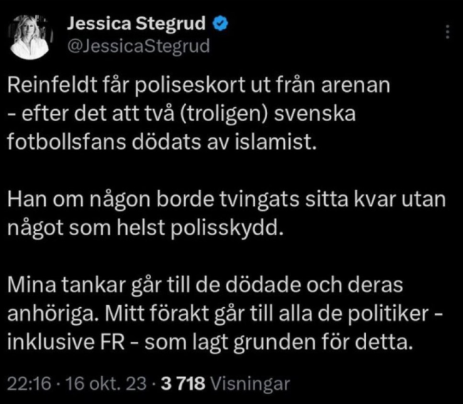 Det fick Sverigedemokraternas riksdagsledamot Jessica Stegrud att reagera. I ett inlägg på plattformen X skrev Stegrud ”Reinfeldt får poliseskort ut från arenan – efter att två (troligen) svenska fotbollsfans dödats av islamist. Han om någon borde tvingats sitta kvar utan något som helst polisskydd. Mina tankar går till de dödade och deras anhöriga. Mitt förakt går till alla de politiker – inklusive FR – som lagt grunden för detta.”