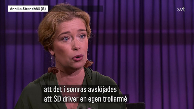 – Jag tycker själv att det är oerhört märklig att det faktum att i somras avslöjades att Sverigedemokraterna driver en egen trollarmé, och det nätverk de har med kopplingar till alternativmedier, att det inte granskades mer, säger Strandhäll och fortsätter.