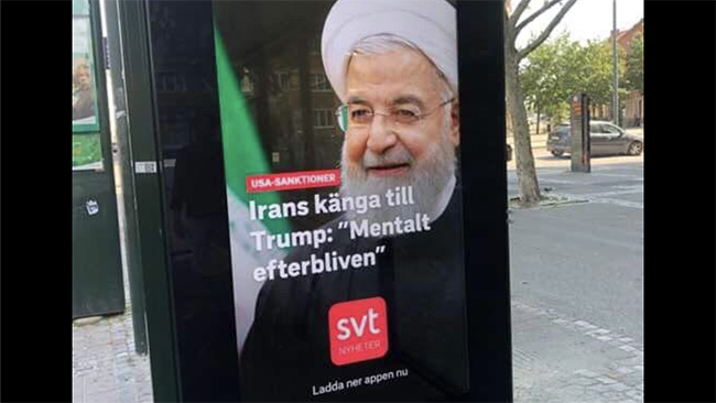 SVERIGE Sveriges Television är i ordentligt blåsväder efter att en interaktiv reklamskylt för SVT visat upp en bild på Irans president Hassan Rouhani och ett citat från honom om Donald Trump: ”Mentalt efterbliven”.