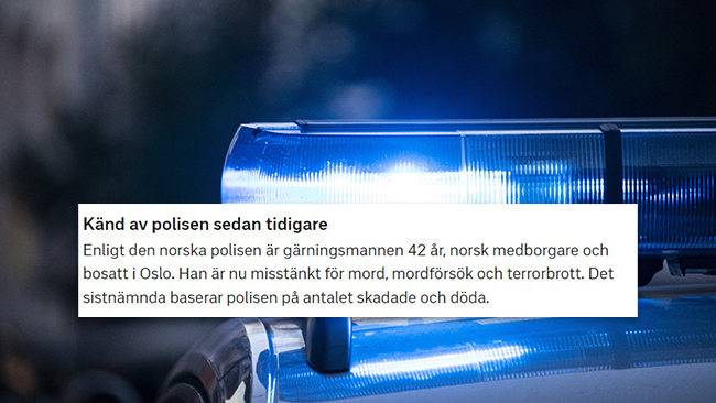 Svenska SVT utelämnar emellertid mannens utländska bakgrund, men påpekar att han är norsk medborgare. ”Enligt den norska polisen är gärningsmannen 42 år, norsk medborgare och bosatt i Oslo” skriver SVT.