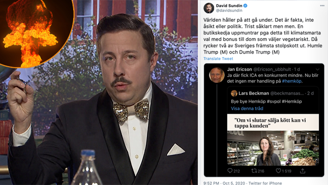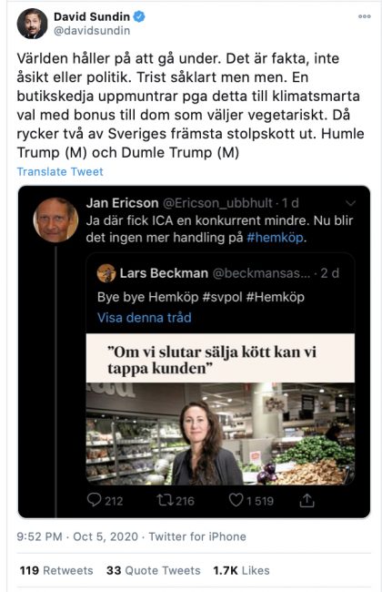 ”En butikskedja uppmuntrar pga detta till klimatsmarta val med bonus till dom som väljer vegetariskt. Då rycker två av Sveriges främsta stolpskott ut. Humle Trump (M) och Dumle Trump (M).”