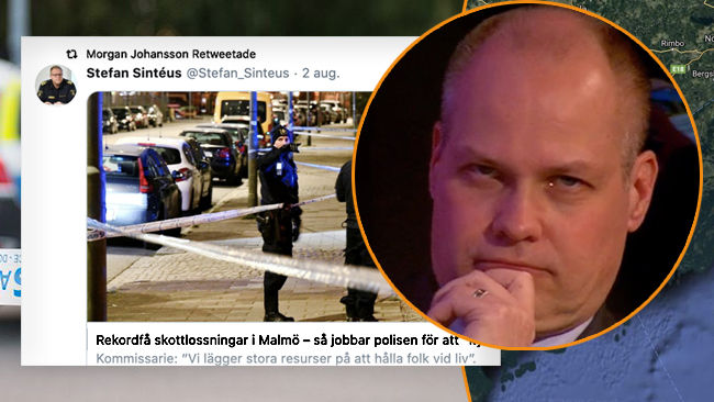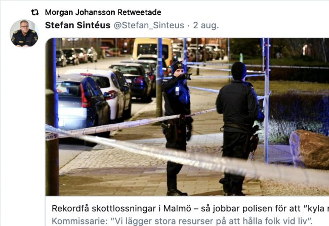 Det var polischefen Stefan Sintéus i Malmö som på söndagsmorgonen twittrade ut en länk till en artikel i Sydsvenskan om minskat antal skjutningar i Malmö. Kort därefter retweetades han av justitieminister Morgan Johansson.